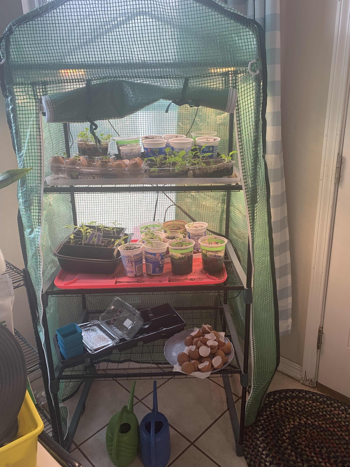 My husband had this little greenhouse stored away. It was advertised to be used outdoors but it can’t hold up to Oklahoma wind.